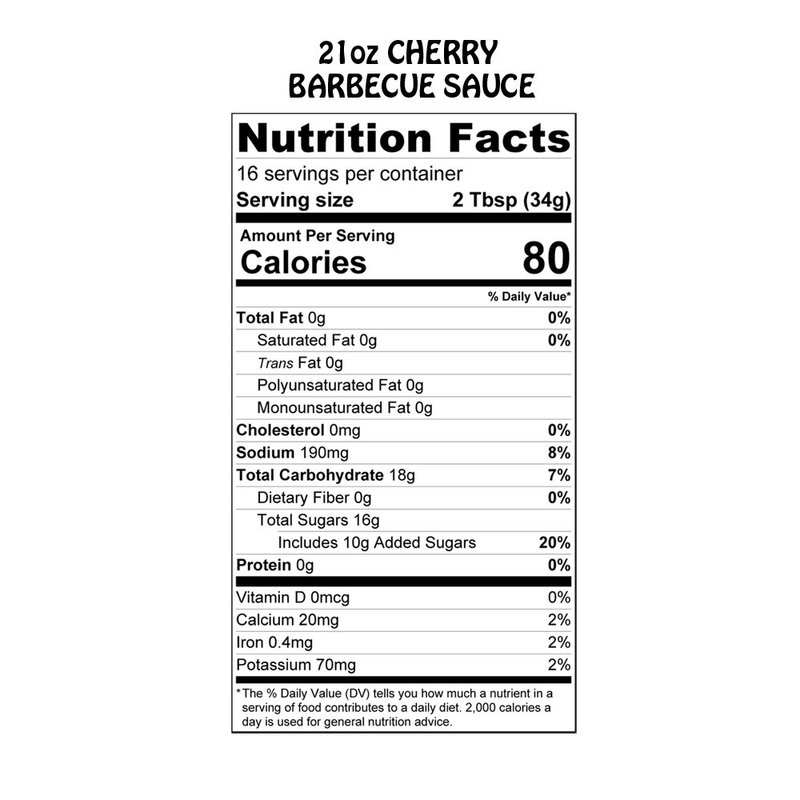 Net Weight: 21 Ounces INGREDIENTS: Michigan Tart Cherries, Cane Sugar, BBQ Blend (Water, Sugar, Tomato Paste, Molasses, Distilled Vinegar, Modified Corn Starch, Salt, Hydrolyzed Soy Protein, Tapioca Starch, Onion Powder, Garlic Powder, Spices, Caramel Color, Spice Extractives, Natural Smoke Flavor, Mustard Flour, Caramel Color, Dried Onion, Potassium Sorbate and Sodium Benzoate, Dried Garlic, Chili Powder, Xanthan Gum, Dried Red Pepper, Spice), Cider Vinegar, Lemon Juice (Lemon Juice, Sodium Bisulfite, Sodium Benzoate, Lemon Oil), Cherry Juice Concentrate, Apple Pectin, Cinnamon, Almond Extract (Water, Alcohol, Bitter Almond Oil)