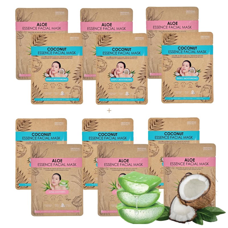 ORIGINAL DERMA BEAUTY 12PK (6+6) Vegan Face Masks for Skincare - Coconut, Aloe, Vitamin, Cucumber Facial Sheet Mask Korean Skin Care (Coconut & Aloe)