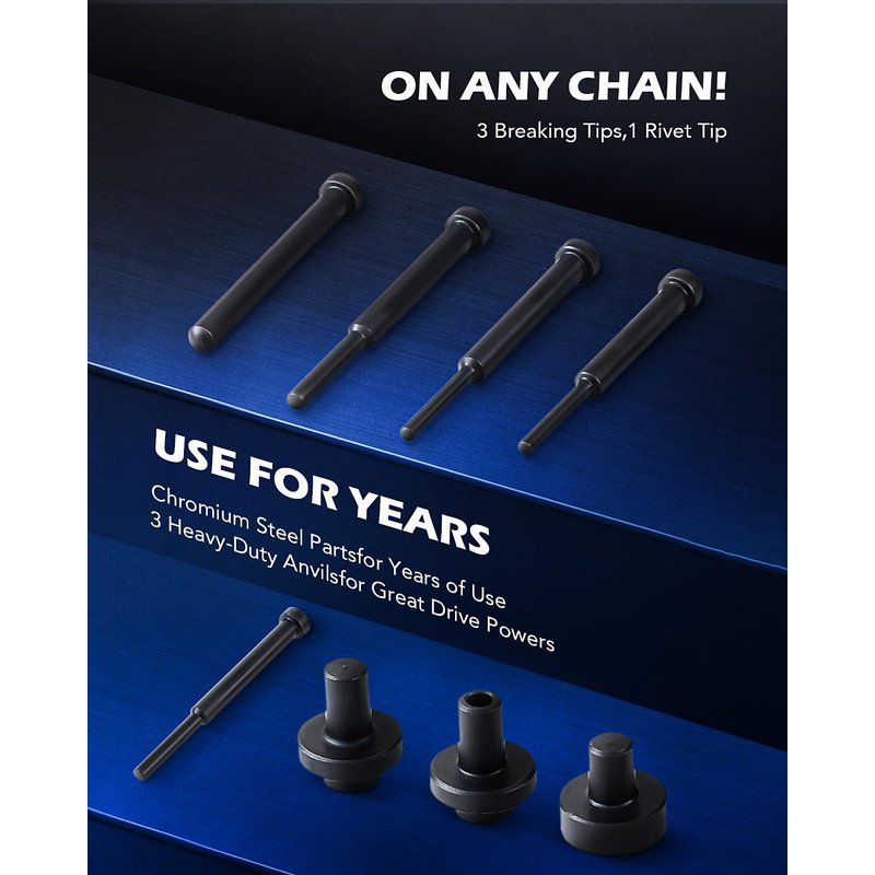 - WIDE APPLICATION: Our chain tool kit is versatile enough to be used on bikes, motorcycles, ATVs, and more; use the 2.2 mm break tip to handle almost any cam chains, the 2.9 mm break tips for #25 to #35 chains, and the 3.8 mm break tips for #428 to #630 chains