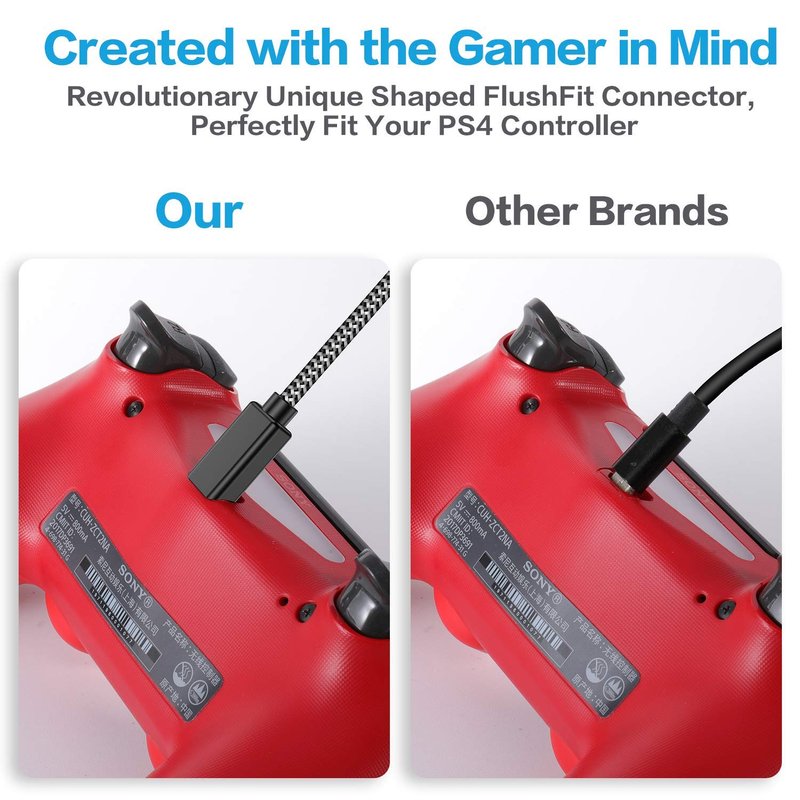- 🎮 BEST PS4 CABLE EVER - Created with the gamer in mind, what makes our upgraded cable stand out from the rest is the unique flush fitting curved connector is designed to fit the contoured back of the ps4 controller's body meaning a really nice snug fit, unlike other cables including Sony's original cable that can get loose and fallout without much movement.
