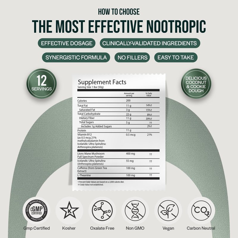 - NOOTROPICS-INFUSED SNACK: Look no further for a boost! Our bars combine Icelandic Ultra Spirulina with clinically tested white-label ingredients like L-Theanine, Lion’s Mane Mushroom, Green Tea Caffeine, and Vitamin B6. Combat fatigue and enhance mental and athletic performance without experiencing a crash later on.