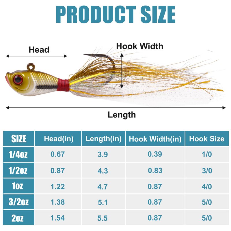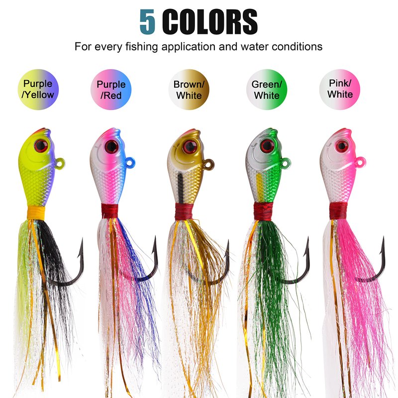 - đăSize & QuantityăOROOTL 5 Pack Bucktail Jig Lures Hair Jigs. Select from 1/4 oz, 1/2 oz, 1 oz, 3/2 oz, 2 oz, optional 5 colors. The Bucktail Jigs have a wide variety of applications in both saltwater and freshwater during the summer and winter season.