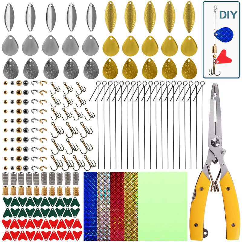 - 【Complete Lure Making Kit】Including 1pcs fishing pliers, 30pcs spinner blades, 20pcs treble hooks, 20pcs wire shaft, 20pcs clevises, 20pcs lure bodies, 40pcs beads, 50pcs split rings, 5pcs holographic adhesive film, 40pcs plastic heart sheets. Take the DIY fishing lures making kit to create your own perfect lures