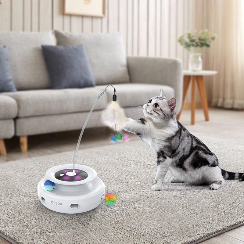 ORSDA 3-IN-1 interactive cat toys seek to engage cats' natural instincts: chasing, pouncing, ambushing. Spinning balls stimulates your cat’s senses. Popping feather stimulates hunting instincts. And rotating butterfly encourages to chase. Great Way to Get the Cat Moving. An ORSDA 3-in-1 cat toy equals 3 single-functional cat toys.