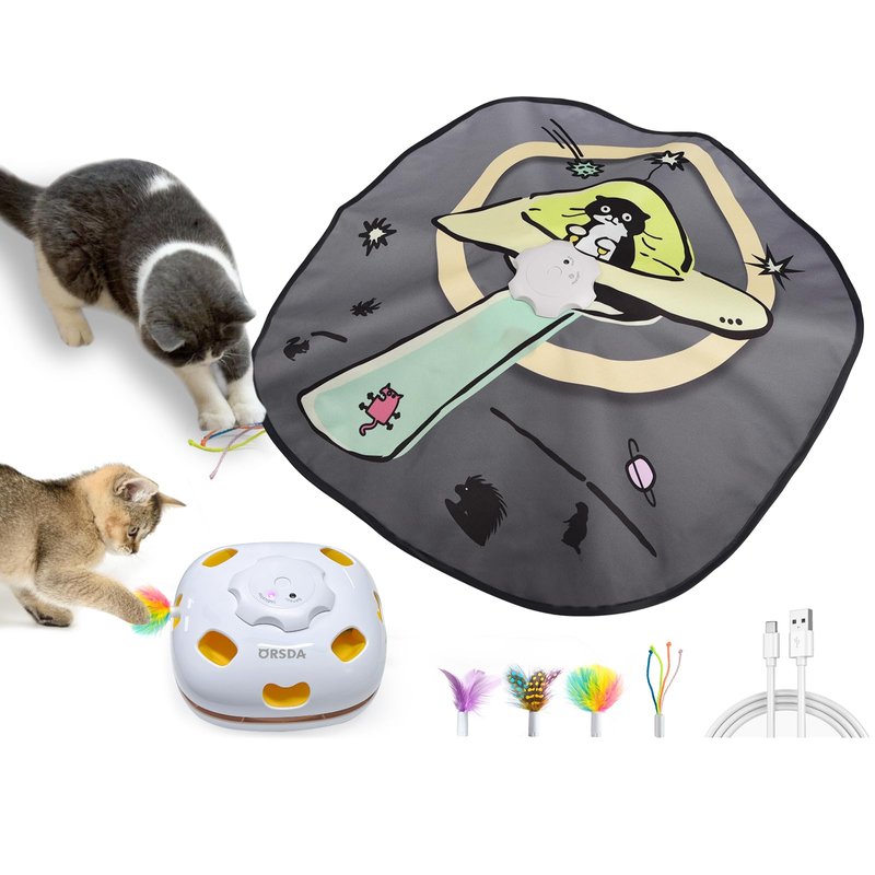 - 🐱【4-in-1 Interactive Entertainment Cat Toy】ORSDA automatic cat toy comes with a removable play blanket which allows the toy to move unpredictably,then you can just see all those cat predator instincts energizing them they can hardly contain themselves! When your cat gets tired of playing with the cover, remove it and the long spinning wand entices your cat to pounce, while the feathers that pop out of the holes stimulate a game of whack-a-mole.