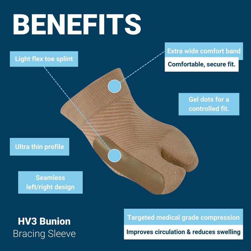 The OS1st HV3 Bunion Bracing Sleeve was designed with a light-flex toe splint along with an anatomically correct split-toe design to provide relief of bunion pain, realign toe angles, and reduce forefoot swelling. The built-in stay-in-place system keeps the brace from slipping and keeps the brace aligned so the splint can effectively straighten the Hallux and help separate toes for gradual correction. The brace fits easily with sandals or inside any shoe, for ease of use. For the best fit, please refer to our sizing chart.