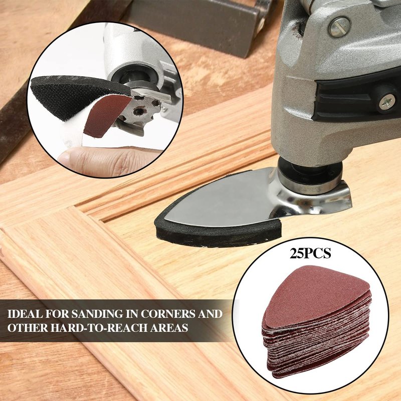 Oscillating Tool Sanding Pad Kit: Include 2pcs triangle sanding pads and 2Pcs finger sanding pad. 25 Pcs finger sandpaper and 25 pcs triangle sandpaper. Finger sandpaper – (5) 60 grit, (5) 80 grit, (5) 120 grit, (5) 180 grit, (5) 240 grit; Triangle Sandpaper – (5) 60 grit, (5) 80 grit, (5) 120 grit, (5) 180 grit, (5) 240 grit. for Wood/plaster polish sanding, & other surfaces, different grit sandpaper can be sanded for different materials to achieve the best results.