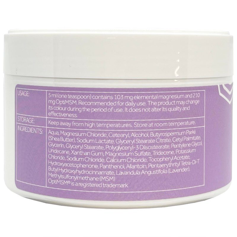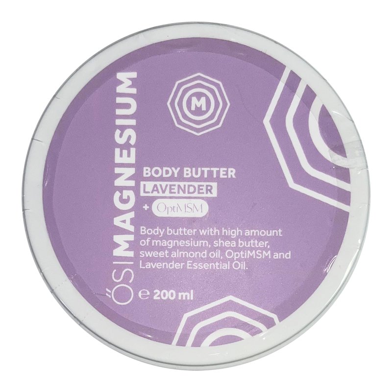 ŐSIMAGNESIUM Lavender Body Butter + OptiMSM is a unique formula made of 250 million years old ŐSIMAGNESIUM Oil that delivers a large dosage of magnesium directly into the body. Our blend includes 25% ŐSIMAGNESIUM Oil, OptiMSM, shea butter and lavender oil to provide you with maximum absorption and nourishment. By coating your skin with our luxurious cream, you can enjoy the lavender combined with the power of magnesium and MSM to help restore balance in your body. Ingredients: Aqua, Magnesium Chloride, Lavandula Angustifolia (Lavander) Oil, Cetearyl Alcohol, Butyrospermum Parkii (Shea Butter), Sodium Lactate, Glyceryl Stearate Citrate, Cetyl Palmitate, Glycerin, Glyceryl Stearate, Polyglyceryl-3 Diisostearate, Pentylene Glycol, Undecane, Xanthan Gum, Magnesium Sulfate, Tridecene, Potassium Chloride, Sodium Chloride, Calcium Chloride, Tocopheryl Acetate, Hydroxyacetophenone, Panthenol, Allantoin, Pentaerythrityl Tetra-Di-T-Butyl Hydroxyhydrocinnamate, Dimethyl sulfone (MSM)