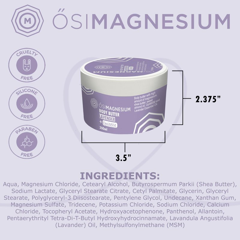 - CARE FROM NATURE: free from silicones, parabens, and any harmful chemicals, the Osimagnesium body butter features a natural formula, enriched with Lavender Essential Oils and the purest magnesium on the market.