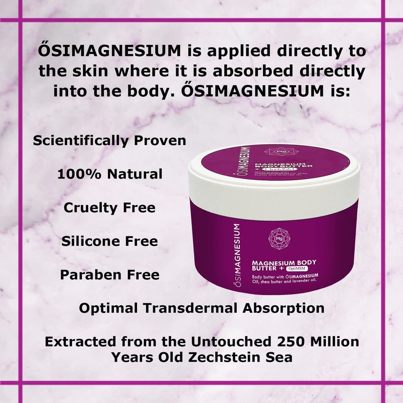 - PUREST, QUALITY MAGNESIUM: extracted from the rich sea bed of the Zechstein Sea, Osimagnesium body butter is made with the highest quality, purest magnesium.