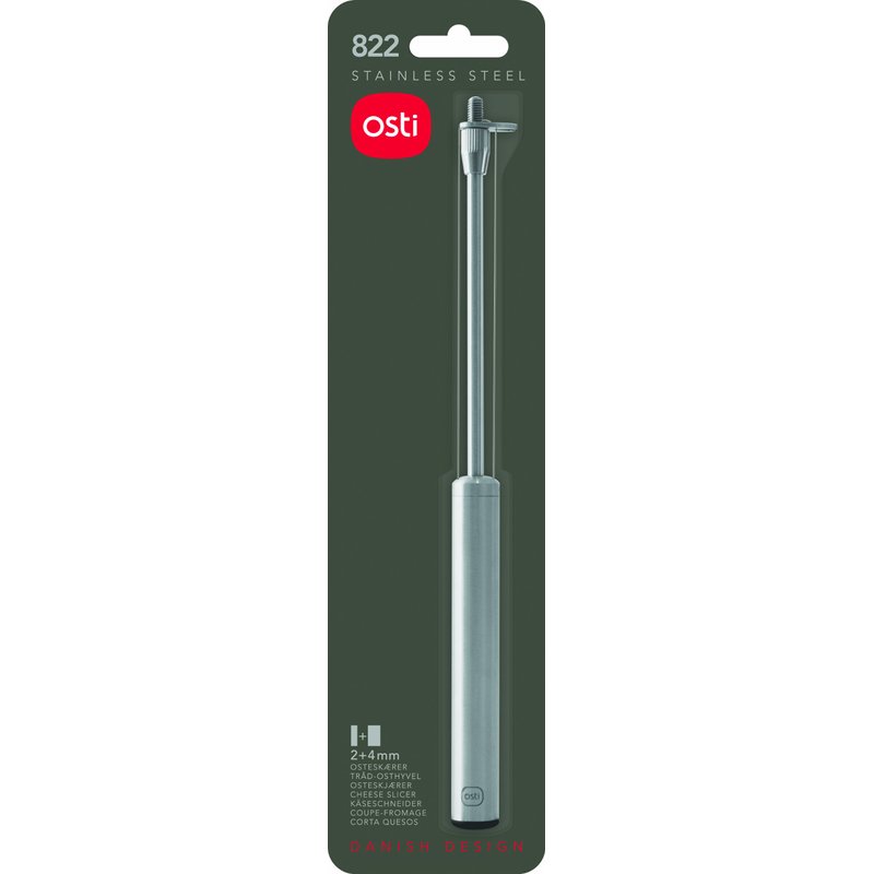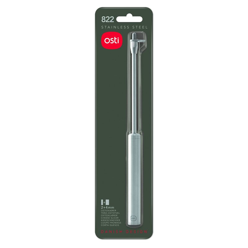 In love with cheese? Add a Danish Classic to your kitchen and your cheese board: The Osti double-stringed cheese slicer was invented by Danish Osti in 1963. Coveted for its classic simplicity, the Osti cheese slicers have since become a household icon for cheese aficionados throughout the world. The all-stainless steel Osti 822 lets you cut both thick and thin slices (5/32β+5/64β) in one. Made from sturdy stainless steel with an elegant, brushed handle, the Osti 822 adds contemporary Danish design to your kitchen and your dining table. Handle a broad variety of semi-hard and semi-soft cheese with ease, including Cheddar, Monterey Jack, Provolone, Swiss Cheese, Gouda, Muenster and many more β and give that extra dash of Danish Design to your cheese board. The built-in cheese fork elegantly lets you lift and place the freshly cut cheese slices. The Osti 822 goes directly in the dishwasher, and is suitable for both kids and grown-ups, letting the whole family enjoy cheese the way itβs meant to: At Osti we know that freshly sliced cheese just tastes better. Whether for cherishing your cheese board, prepping your picnic, going upscale on your get-together or simply enjoying cheese, you will not go wrong with the Osti 822.