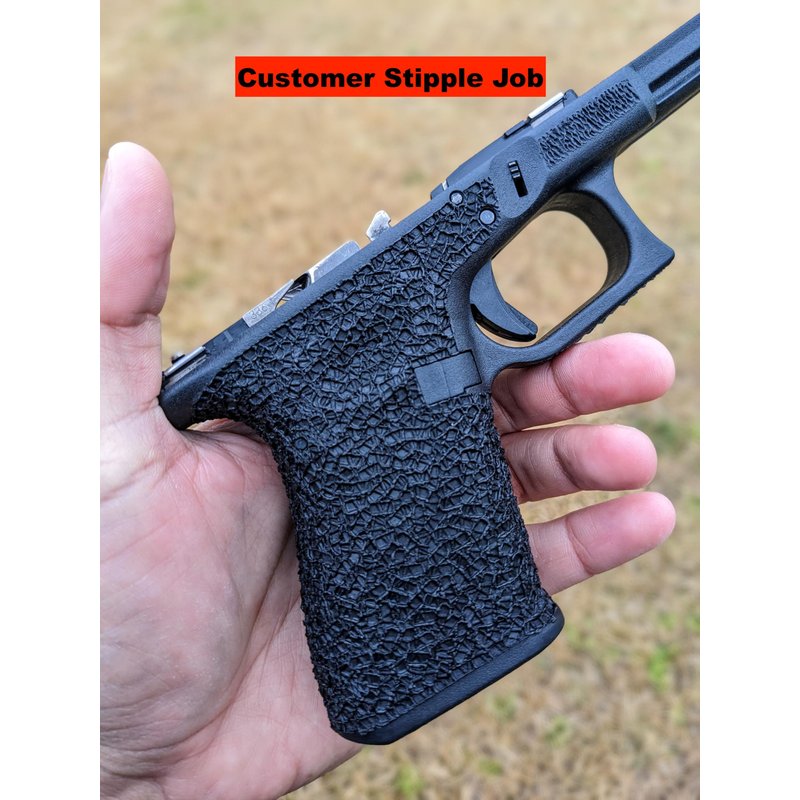The EDC Tip. One of those tips that goes on easy, and is easy on the hand or body if you want something that is stippled all the way around but won't eat your side. Simply apply at random, with a little bit of overlap at random! High glass content frames (SIG, SW..) you will likely want to run a 180 grit dremel scotch brite wheel over it Lightly, at least on the body side as you carry, as the higher glass fill makes it a bit more 'sharp' than as used on a low glass fill frame (Glock, XD...)