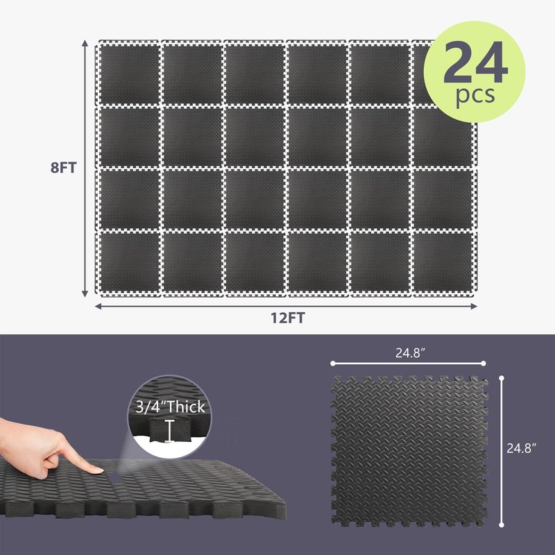 - 【24 Pieces, 96 Square feet】Measures 24.8”L x 24.8”W x 3/4”H of each piece. Include 24 tiles and 48 borders. Covers 96 SQ.FT. EVA foam contains no toxic phthalates.