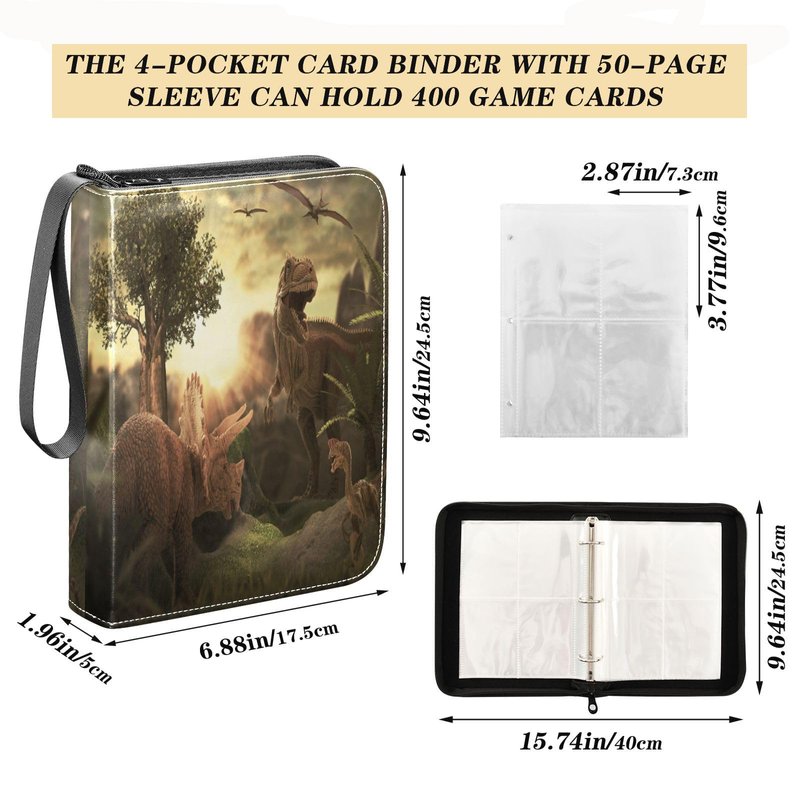OTVEE Dinosaur Card Binder 4-Pocket, 400 Pockets Trading Card Binder Holder with 50 Removable Sleeves, Zipper Card Collection Binder Card Album Book for Football Basketball Baseball Games Sports Cards
