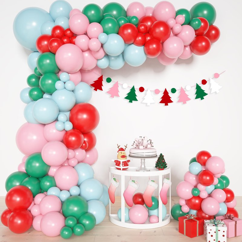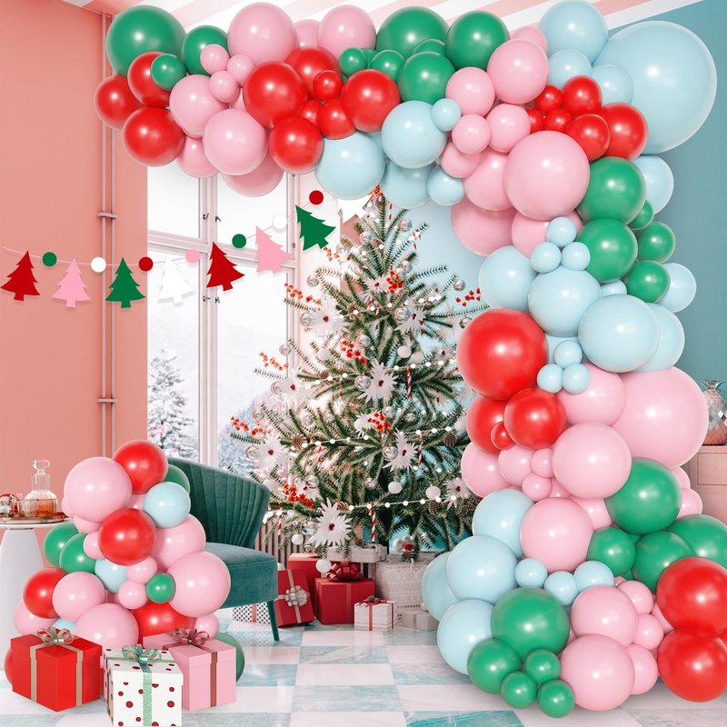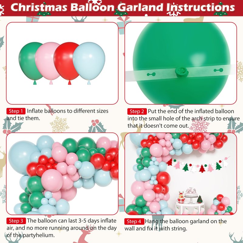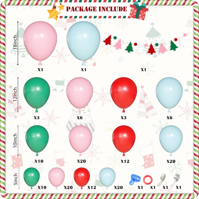 - Christmas Balloon Arch Kit:The package include 144 pcs latex balloon(pastel pink, pastel green, red, dark green), 7 pcs foil balloons, 1 pcs Christmas tree garland, 1 pcs balloon arch strip, 1 pcs 100-glue points, 1 pcs tying tool and 1 pcs red ribbon
