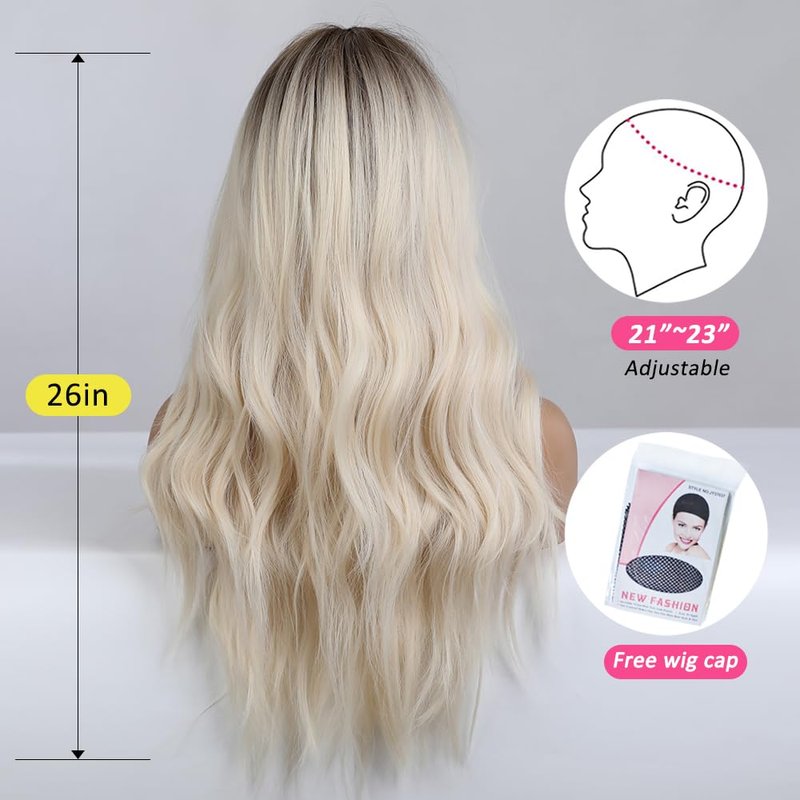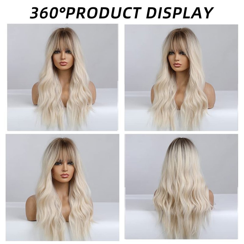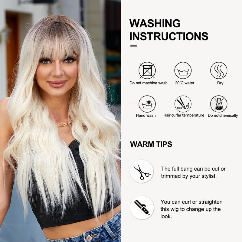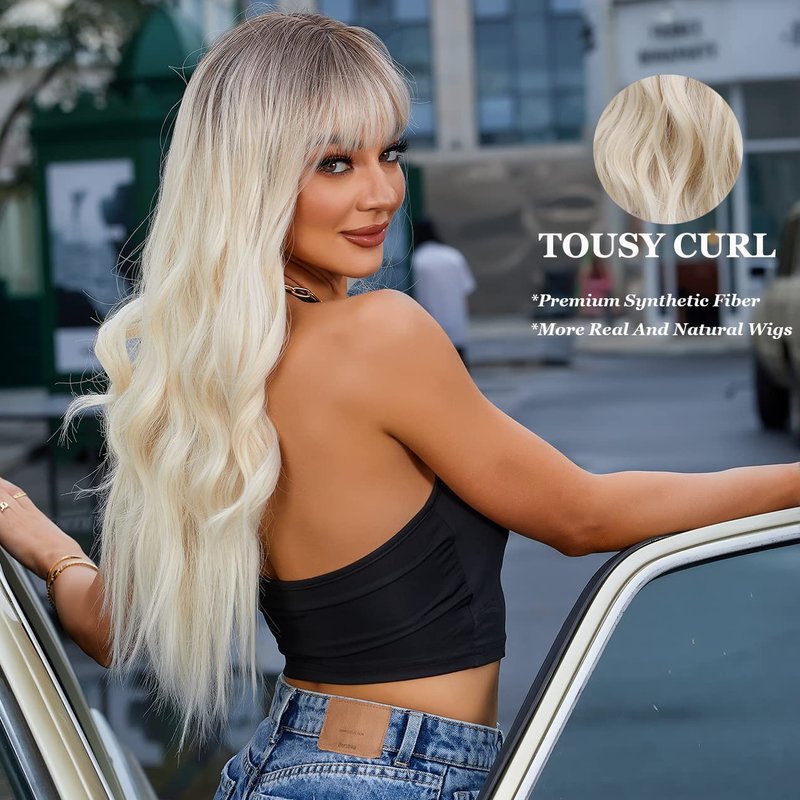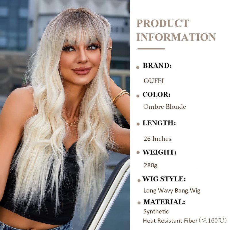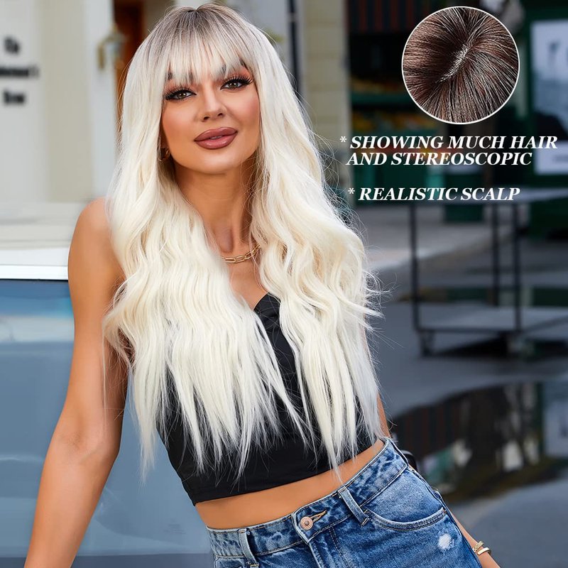 OUFEI Long Wavy Platinum Blonde Wig with Bangs for Women Light Blonde Wig Natural Synthetic Hair Heat Resistant Ombre Wigs for Daily Party Cosplay Wear- 26 Inches