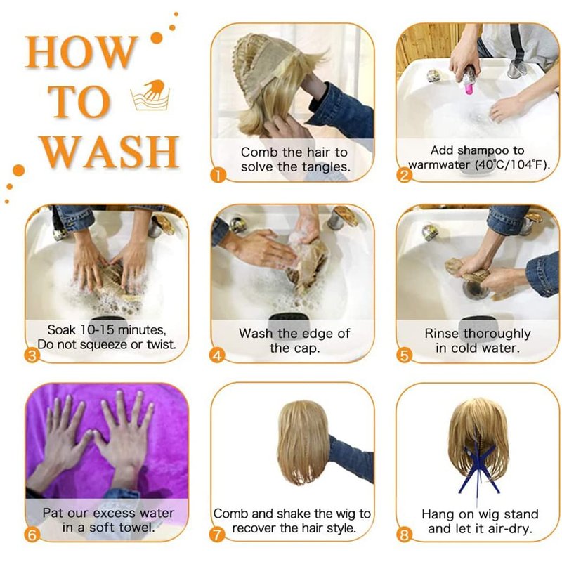 1. Put the wig in cold or warm water for 5 to 10 minutes(20 ℃ water), the time can't be too long, otherwise the hair will be fall off easily.