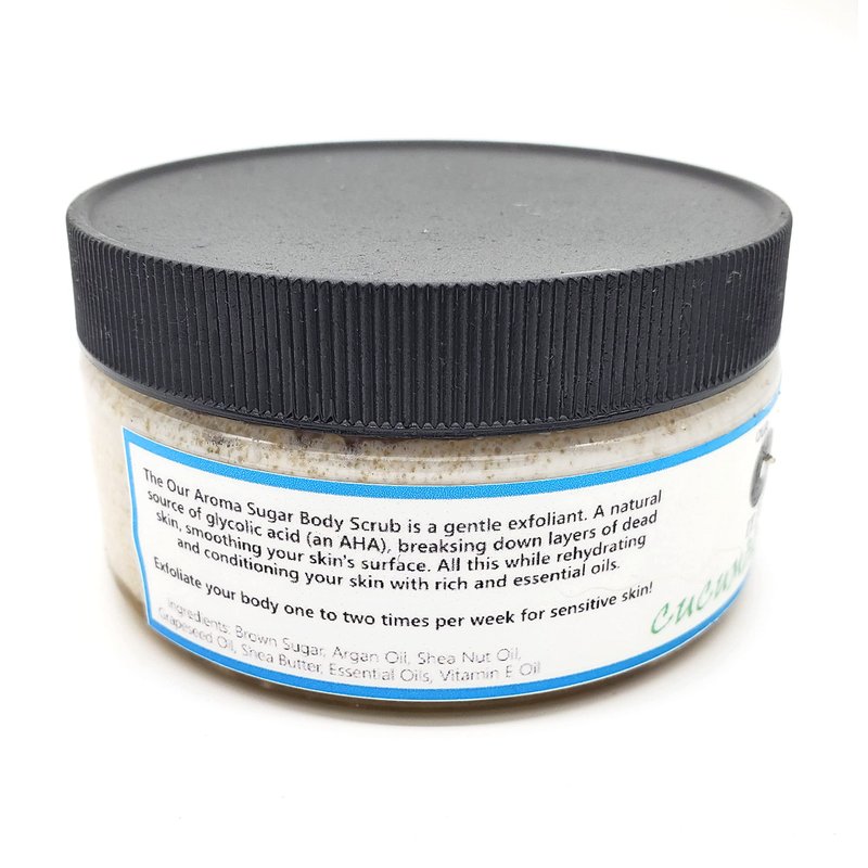 All you need to achieve soft exfoliated skin is Our Aroma's All Natural Cucumber Mint Body Scrub! A soft but dense scrub, packed with large raw sugar crystals and smoothing oils will have you feeling silky smooth after just one use. Raw sugar retains many of the vitamins and minerals present in natural sugarcane juice, including calcium, magnesium, potassium, and iron-making this a true gift for your skin! This Vegan scrub is made with Turbinado & Cane Sugar mixed with Vitamin E, Apricot Kernel & Sweet Almond Oil, and Organic Jojoba Oil. It is great for all skin types with no added Gluten, Parabens, or Phthalates. Recommended use is 1-2 times a week on the body. Using on the face is not recommended.