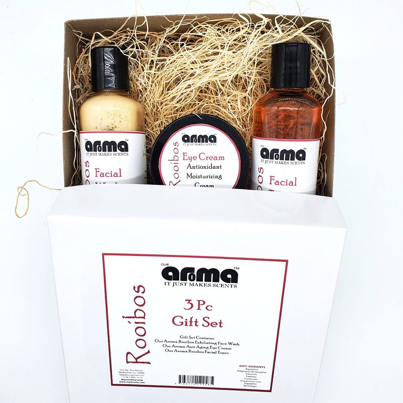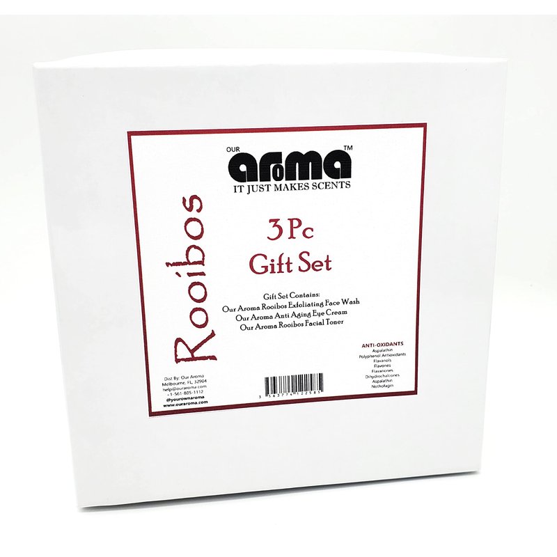 The Our Aroma Gift Set allows you to get 3 of the best performing Our Aroma Rooibos products for yourself or as a gift for someone special in your life. Beautifully packaged in our recycled and natural packaging, you are sure to impress him or her, and all that before they get to experience the wonderful Rooibos products. The Gift Set includes Our Aroma Rooibos Facial Toner - 4 Fl Oz Our Aroma Rooibos Exfoliating Facial Wash - 4 Fl Oz Our Aroma Rooibos Eye Cream - 2 Fl Oz Valued at $50, you get to save as you purchase the gift set, ready to wrap and give away!