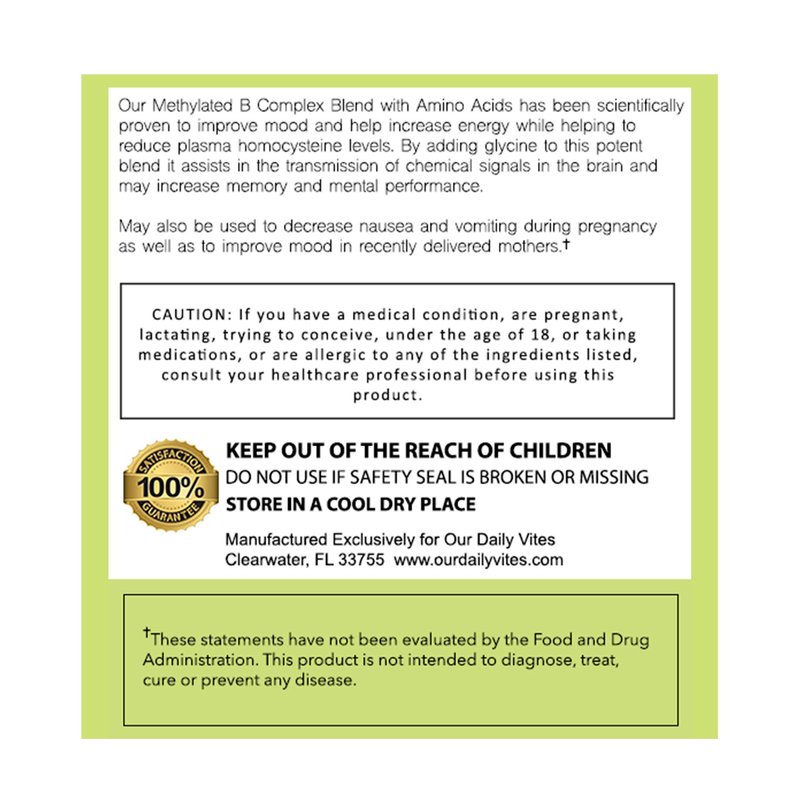 Our Daily Vites L-Methylfolate B Complex Cofactors & Essential Amino Acids (2.5mg) - Active Folate, Methylated B12 Methylcobalamin, B6 and Glycine - 60 Count