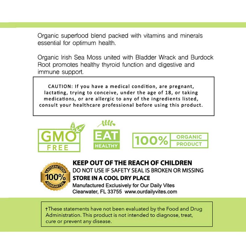 - ✅ ORGANIC & WILDCRAFTED - Our Daily Vites' Organic Sea Moss 1500 MG 120 Ct Wildcrafted Irish Sea Moss, Bladderwrack and Burdock Root Capsules are 100% Natural, Organic, Wildcrafted, Vegan and Filler Free. We give you a nutrient dense way to nourish your body with 92 minerals and immune boosting antioxidants while also aiding in digestion and gut health. This powerful superfood blend makes it a complete full body cellular supplement.
