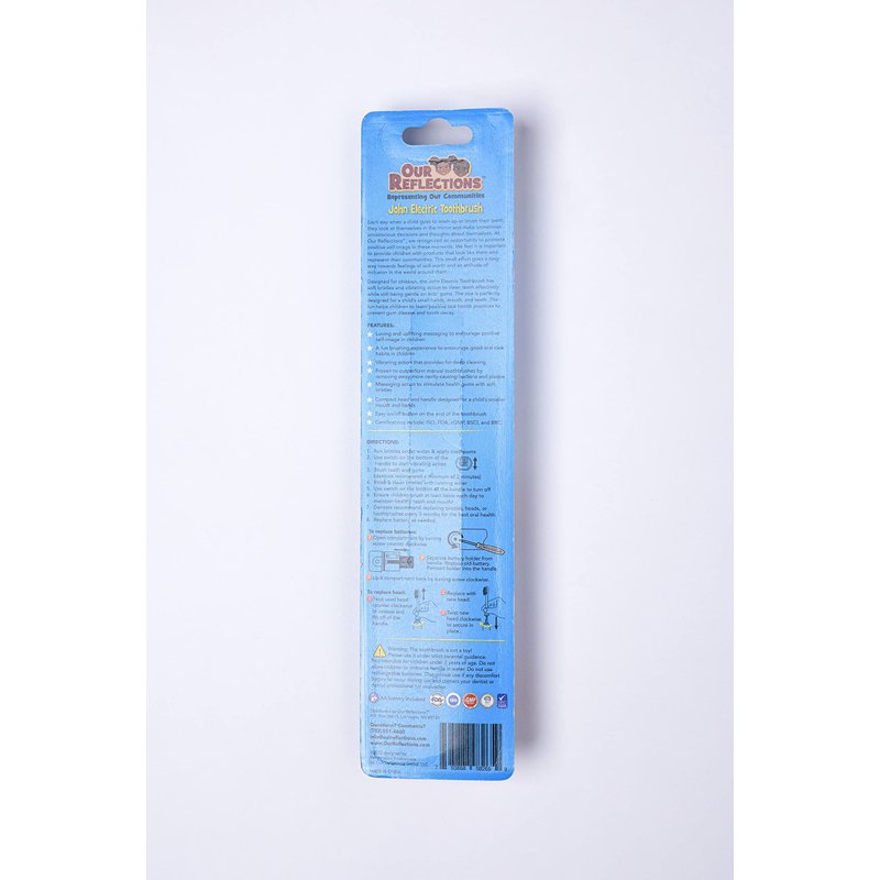 Each day when a child goes to wash up or brush their teeth, they look at themselves in the mirror and make sometimes unconscious decisions and thoughts about themselves. At Our Reflections, we recognized an opportunity to promote positive self-image in these moments. We feel it is important to provide children with products that look like them and represent their communities. This small effort goes a long way towards feelings of self-worth and an attitude of inclusion in the world around them. Designed for children, the John and Nora Electric Toothbrush has soft bristles and vibrating action to clean teeth effectively while still being gentle on kids’ gums. The size is perfectly designed for a child’s small hands, mouth, and teeth. The fun helps children to learn positive oral health practices to prevent gum disease and tooth decay. FEATURES: * Loving and uplifting messaging to encourage positive self-image in children * A fun brushing experience to encourage good oral care habits in children * Vibrating action that provides for deep cleaning * Proven to outperform manual toothbrushes by removing away more cavity-causing bacteria and plaque * Massaging action to stimulate healthy gums with soft bristles * Compact head and handle designed for a child’s smaller mouth and hands * Easy on/off button on the end of the toothbrush * Certifications include: ISO, FDA, cGMP, BSCI and BRC ***Warning: The toothbrush is not a toy! Please use it under strict parental guidance. Not intended for children under 3 years of age. Do not allow children to immerse handle in water. Do not use rechargeable batteries. Discontinue use if any discomfort begins to occur during use and contact your dentist or dental professional for evaluation. 1 AA battery included 2 Toothbrush heads included