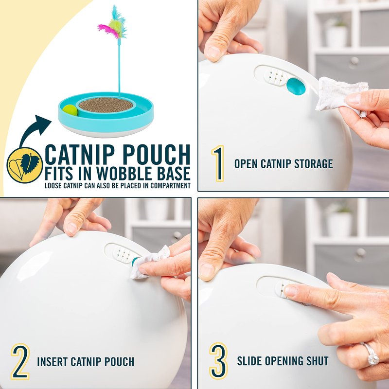 - CATNIP COMPARTMENT: The wobble base also includes a compartment to add catnip to entice cats to the toy! Cosmic catnip and silvervine pouch included. Loose catnip or similar cat-approved products can be added.