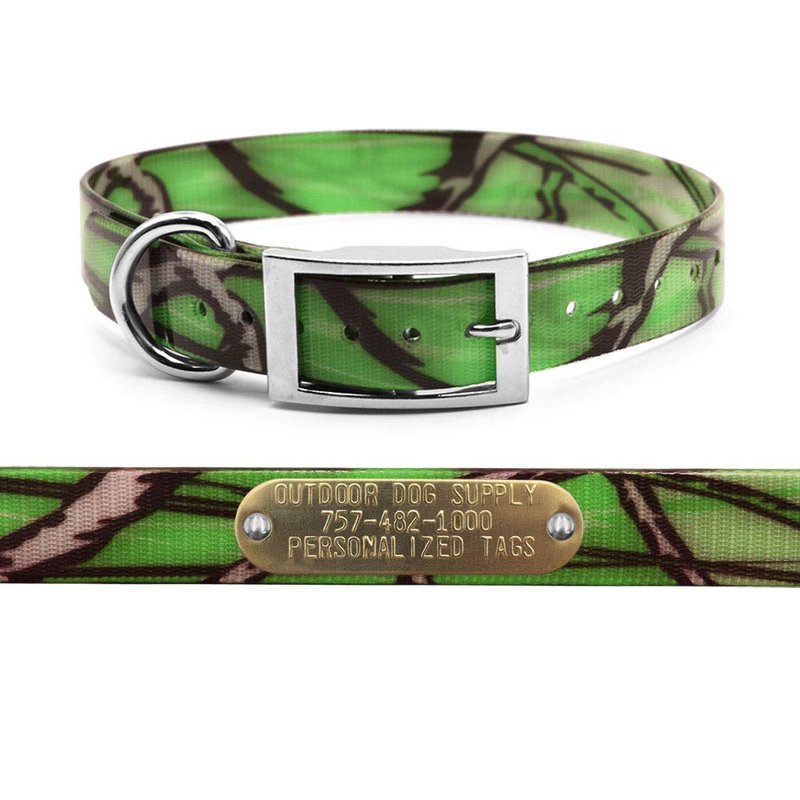Outdoor Dog Supply's 1" Wide Pattern D Ring Dog Collar Strap with Custom Brass Name Plate (21" Long, Green Camo)