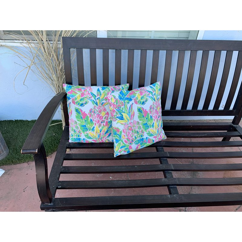 Outdoor Throw Pillow Cover. Premium Quality (See Photos) - Moisture and Fog Resistant!!! Specific Outdoor Extra Strong Thread Used For Stitching. Pineapple, Palm tree, UPLIFTING & VIVID COLORS & WATER COLORS! All of our pillow covers are actually about 1/2 to 1 inch smaller. This ensures a snug fit and plumper looking pillow. Available in 16 x 16, 18 x 18, 20 x 20, 22 x 22, 24 x 24, AND custom size upon request. If you prefer a specific size that is not listed here, please drop me a line so we can always customize the size for you. Invisible zipper opening. Serged for professional finish. Pillow insert NOT included. Spot clean ONLY. Wrinkle free and easy to maintain.