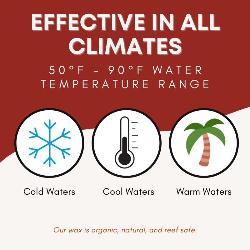 - Indicated for water temperatures of 50°F to 90°F, accommodating tropical, warm, cool, and cold water temperatures, so you will always have the perfect wax available