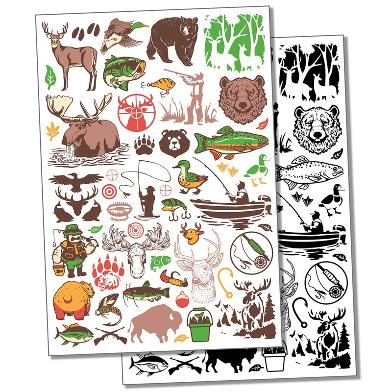 Outdoors Animals Hunting and Fishing Temporary Tattoo Water Resistant Fake Body Art Set Collection - Black (One Sheet)