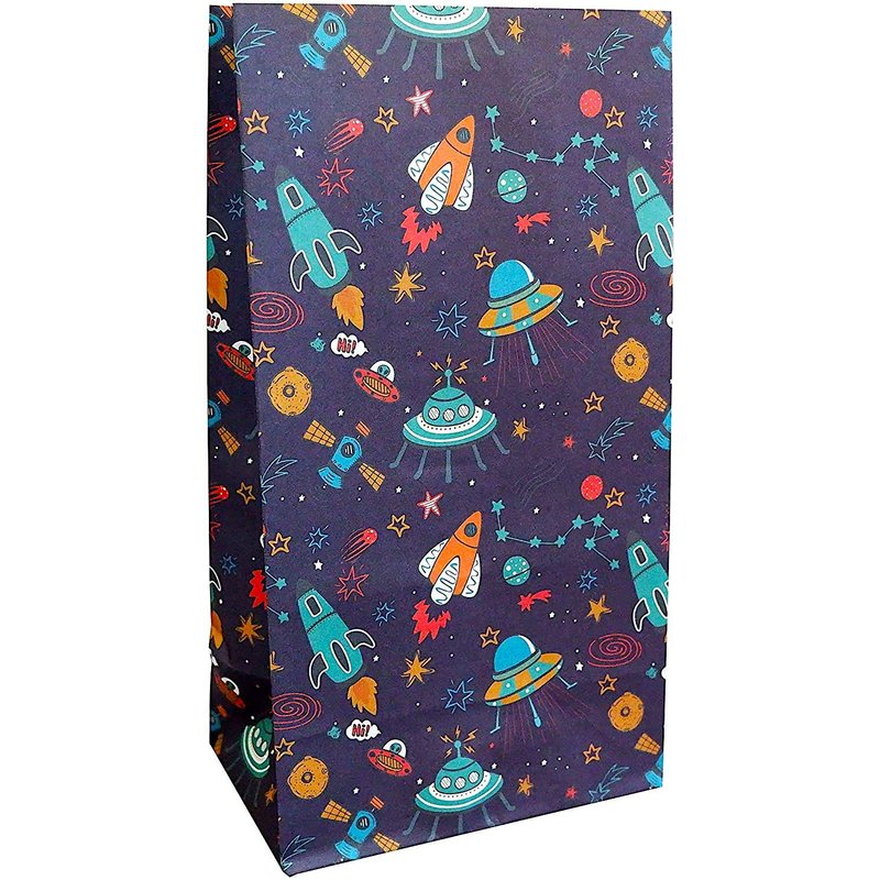 24-COUNT: Each pack includes 24 outer space pattern design printed kraft paper favor bags. HIGH QUALITY: Made out of thick, durable, 100 gsm paper stock for best support - stuff the goodie bags with up to 5 lbs of candy with no problem. 360° PRINTING: Seamless design to cover each corner with this colorful pattern- Multicolored space ship design printed on dark blue kraft paper bag. ALL OCCASIONS: Perfect for parties with outer space theme such as birthday, baby shower, celebration party. MADE WITH FOOD GRADE MATERIAL - Enjoy with peace of mind.