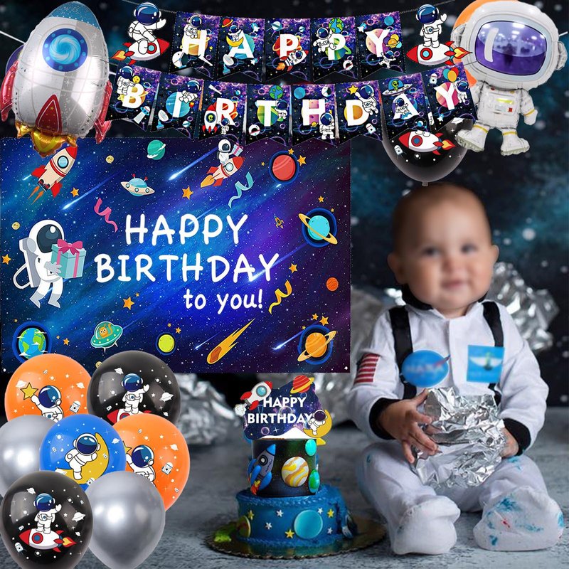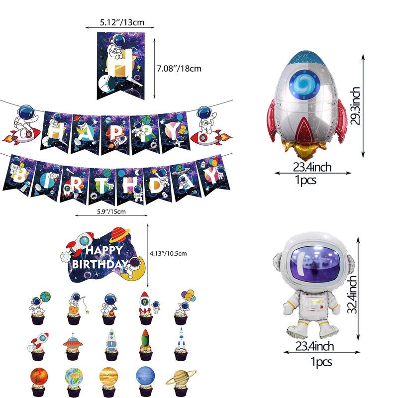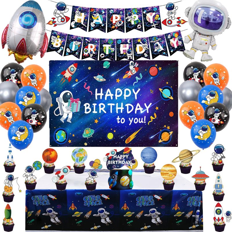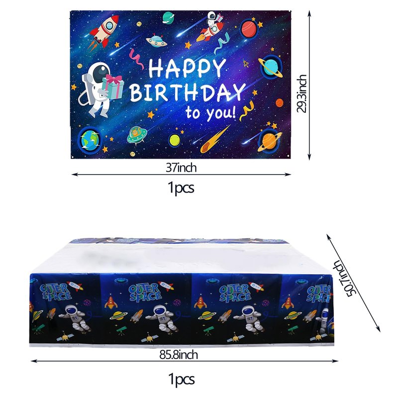 - Outer Space Party Decorations Includes:1Pcs Space Themed Banner, 1Pcs cake topper, 15Pcs cupcake toppers, 16Pcs Outer Space balloons, 1Pcs Space Themed tablecloth, 1Pcs Space Themed backdrop, 2Pcs Space Themed foil balloons, 1Pcs straw, 1 Roll of ribbon, 1 Roll glue point.