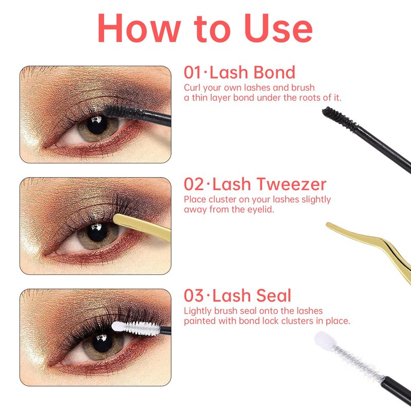 - 【How to Use the Lash Extension Kit】: 1. Curl your lashes with an eyelash curler; 2. Brush a thin layer bond under the roots of your natural eyelashes; 3. Place the lash clusters underneath your lashes; 4. Use lash seal brush to Lock