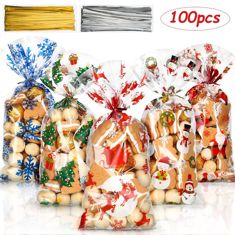 - What you will get: 100 pieces Christmas cellophane treat bags and 100 pieces twist ties, come in 5 different designs 20 of each, twist ties come in 2 different colors 50 of each, sufficient quantity is enough for you to use at Christmas parties and gatherings