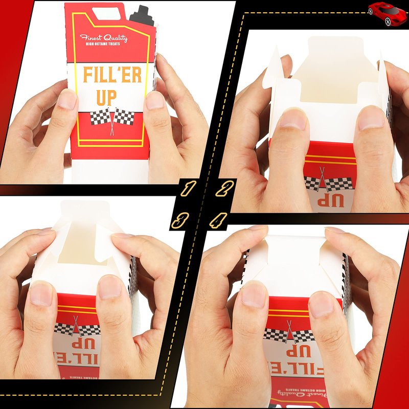 - Racing party popcorn processing box: the racing snack box is easy to assemble; Just press both sides of it at the bottom, then press the paper on the back, and finally put the remaining paper into the slot, keeping your party favors neat and in order