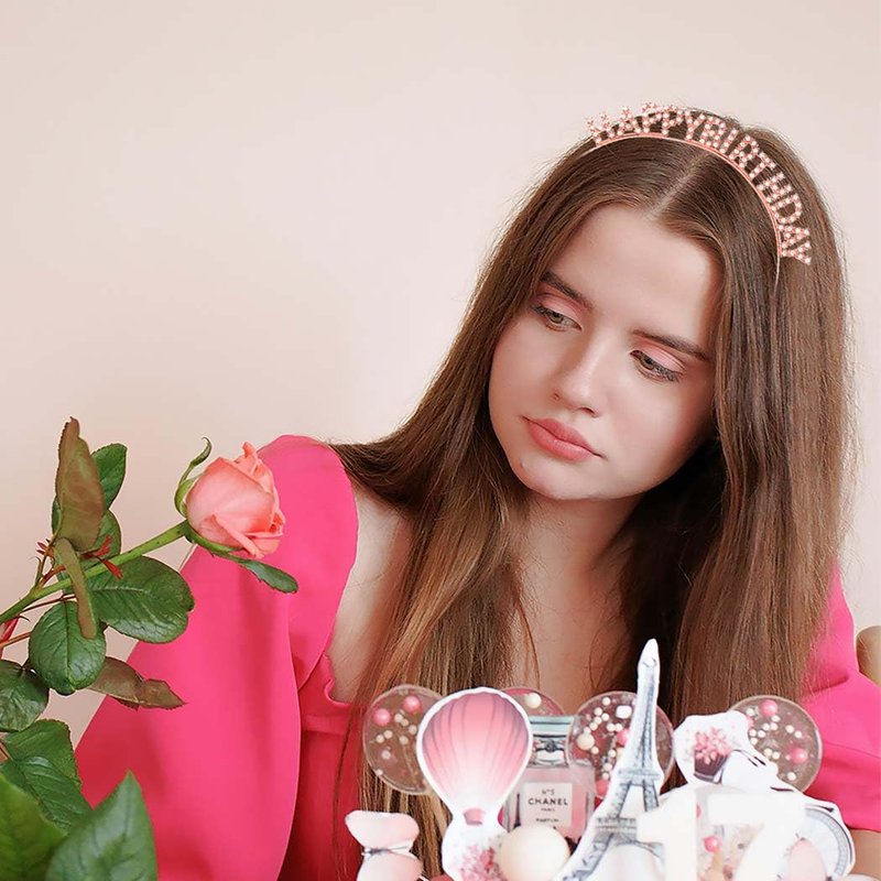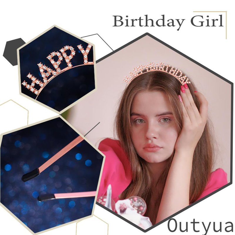 Outyua Birthday Crown Tiara Rose Gold Happy Birthday Headband Rhinestone Princess Birthday Party Decorations for Women Girls