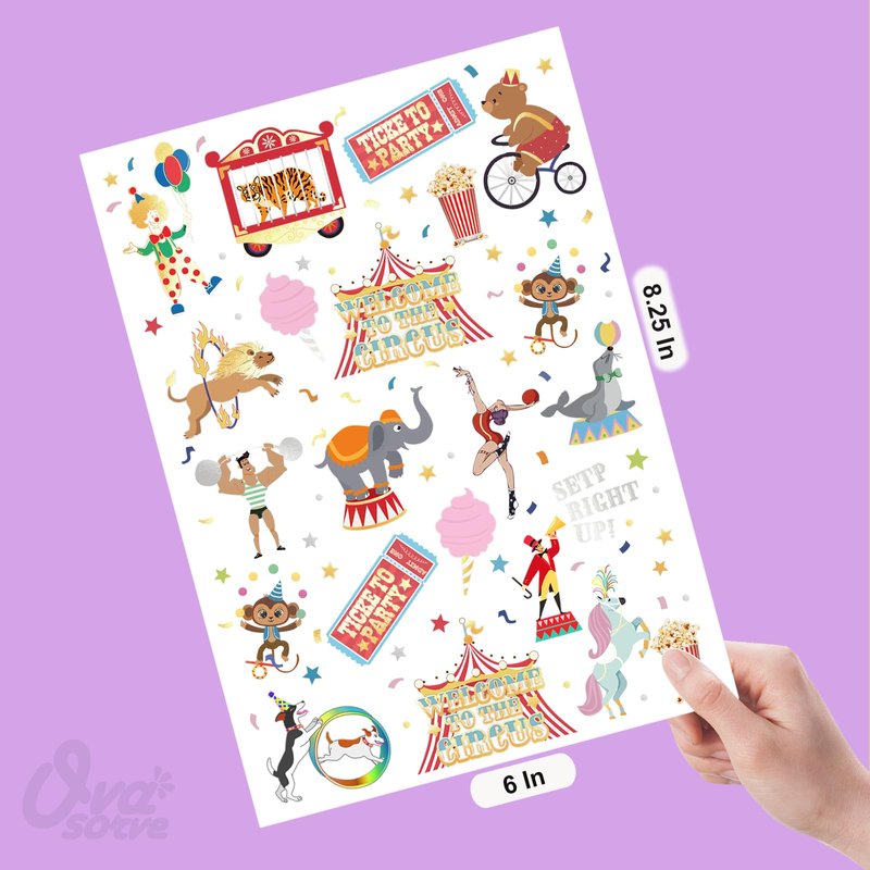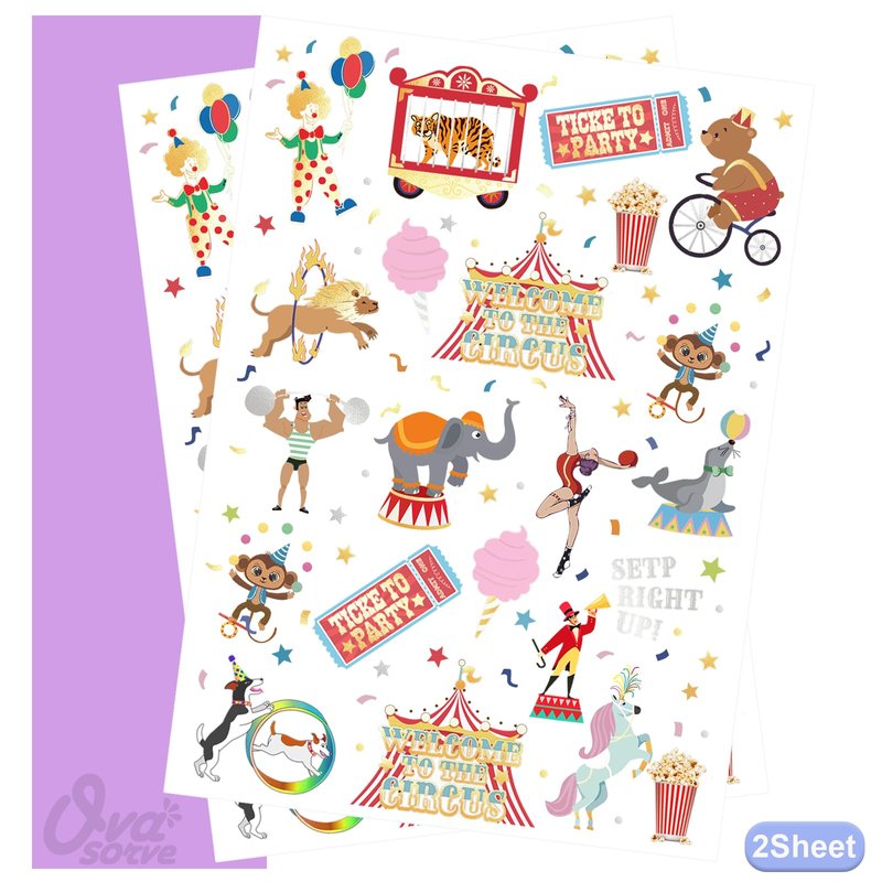 - Exclusive Design: Two sheets with a total of 42 glitter styles tattoos. And the circus tattoos featuring unique designs of elephants, lions, tigers, monkeys, seals, unicorns and other carnival designs like clowns, popcorn, tickets designs that you will love!