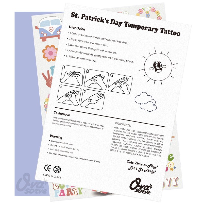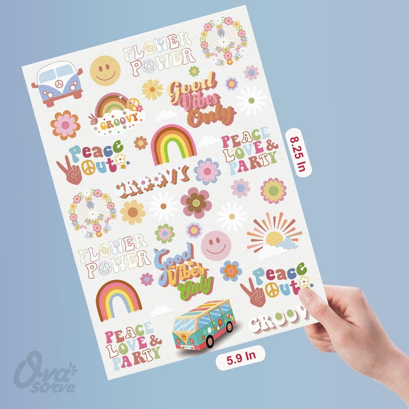 - The Perfect Party Favors: The temporary tattoos are perfect for hippie theme decorations or accessories, party supplies, party favors, DIY decorations and so on. Recommend to apply them to your body and face to take part in the hippie party. It can increase the festive atmosphere! Each sheet measures 8.25 " x 6 " creating the perfect size tattoos!