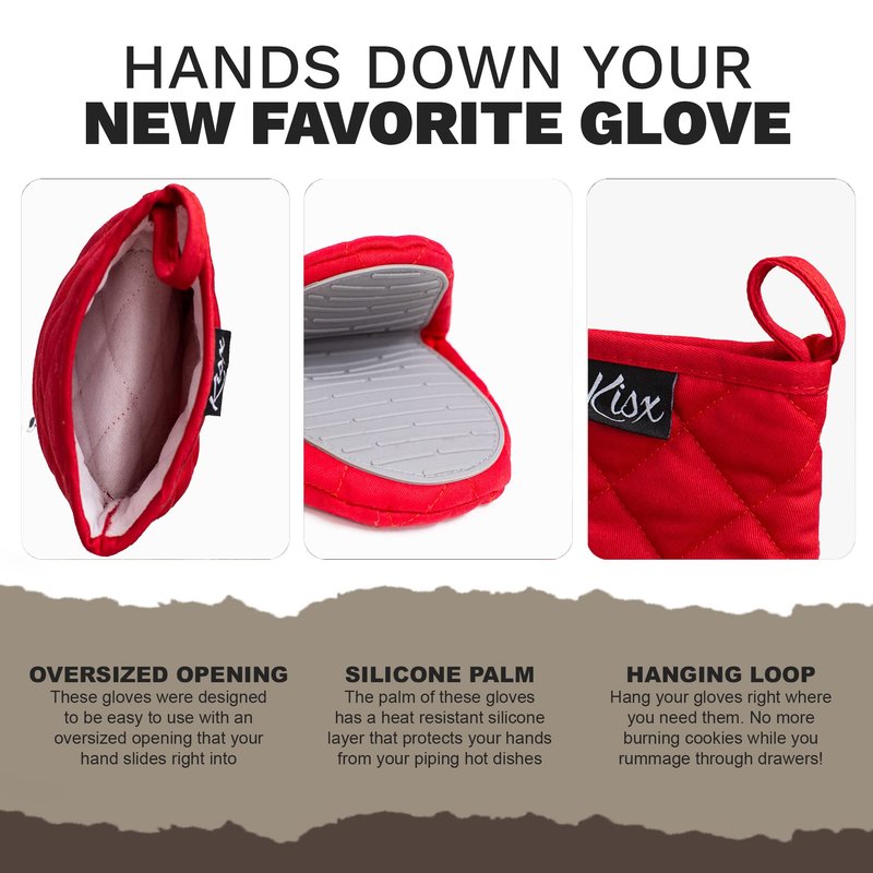 - AN ESSENTIAL KITCHEN ACCESSORIES - Removing a baking tray from the oven? Transferring a hot pot from stove to dining table? Opening the cover of sizzling cooking pot? Protect yourself from burns when cooking. These silicone oven gloves are a great kitchen necessity. It solved the problem of hands burned by the pot or something hot. With Kisx silicone oven mitt set, you will enjoy your cooking than ever before.