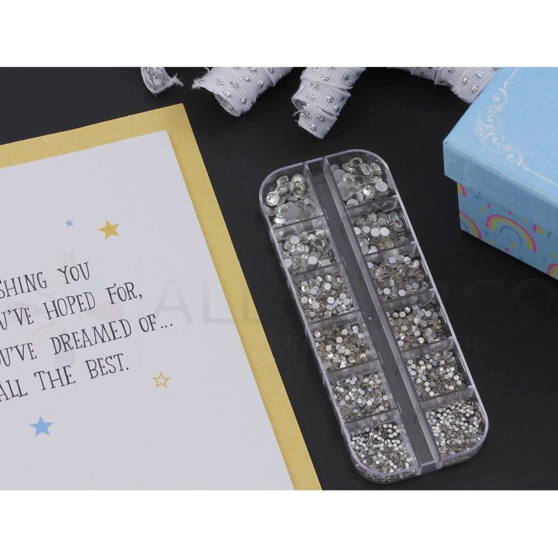 Allstarco's Over 2100 flat back glass rhinestones in 6 different sizes. This product includes 1 storage box of flat back crystals of the chosen color. Material: Glass Crystal. Great for salons nail art, diy projects, embellishments, face art, crafts, wedding, bling, phone, accessories etc. Most popular Sizes: SS4 (1.4mm) - 600 Pieces, SS6 (2mm) - 600 Pieces, SS8 (2.5mm) - 400 Pieces, SS10 (2.9mm) - 400 Pieces, SS16 (4mm) - 100 Pieces and SS20 (4.8mm) - 50 Pieces. These rhinestones are not hot fix rhinestones, use your OWN glue (Glue is not included).