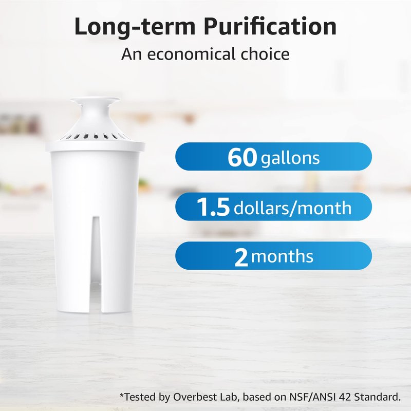 - [Extended lifespan]: You can now enjoy a long service life. Replace it every 2 months or 60 gallons of filtered water with Overbest pitcher water filter, this will vary based on your actual water condition.