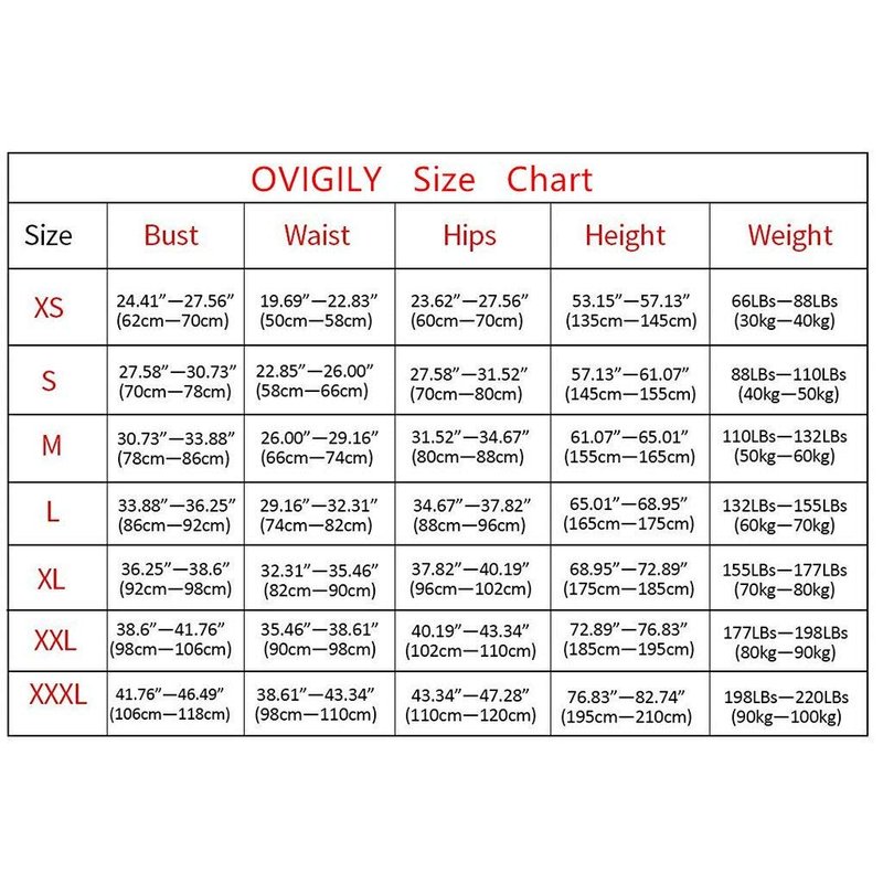 XXXL: Bust: 41.764"- 46.492"(106cm-118cm); Waist: 38.612" - 43.34"(98cm-110cm); Hips: 43.34" - 47.28"(110cm-120cm); Height: 76.83" - 82.74"(195cm-210cm); Weight: 198LBs-220LBs(90kg-100kg)
