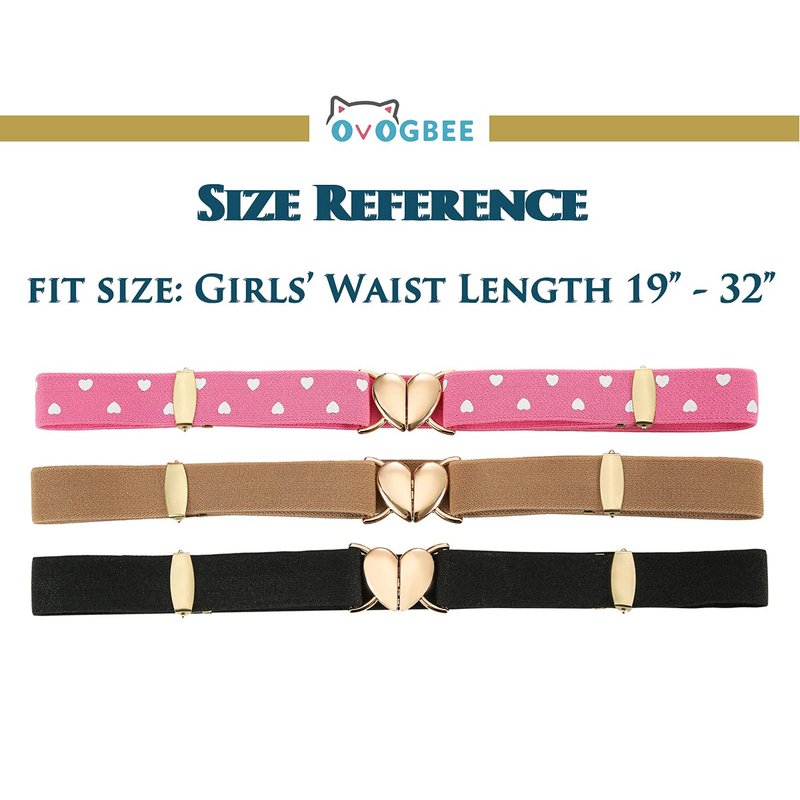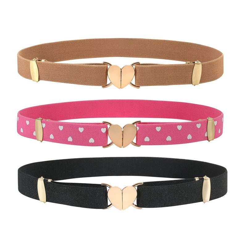 OVOGBEE Elastic Belts for Girls Stretch 3 Pack Little Toddler Teen Kids Adjustable Uniform Belt Girls Fashion Belt Peach Heart Black Pink Brown