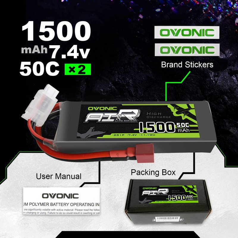 Package Content: 2X Ovonic 7.4V 1500mAh 50C Lipo RC Battery for RC Car Truck Truggy RC Hobby T Plug