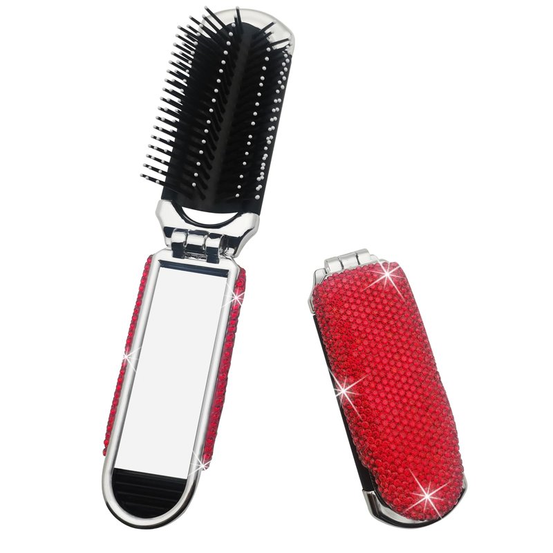 Owemtao Bling Travel Folding Hair Brush with Mirror and Rhinestones - Compact Collapsible Brush for Women (Red)