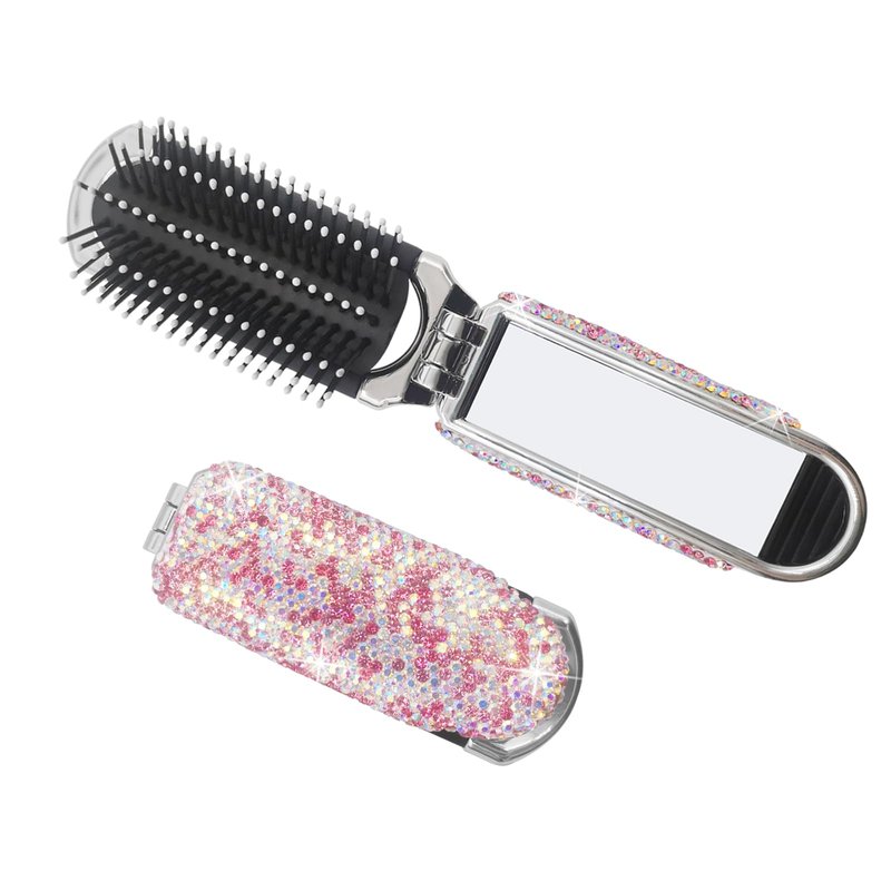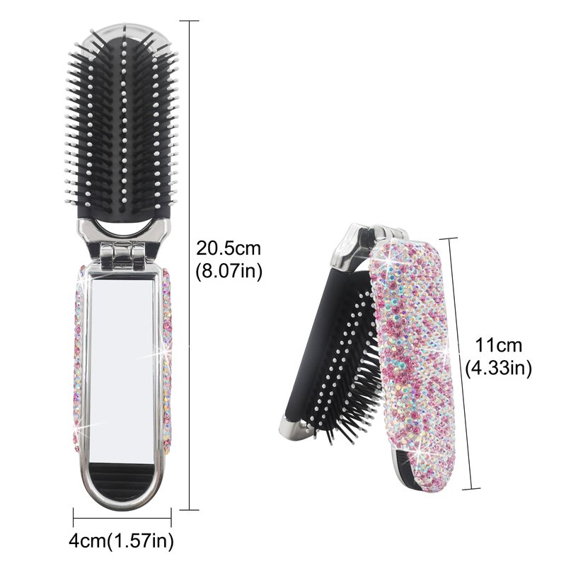 Owemtao Bling Travel Hair Brush Portable Folding Hair Brush with Mirror,Rhinestone Folding Pocket Hair Brush Mini Compact Hair Comb Collapsible Pocket Brush for Women (Pink)