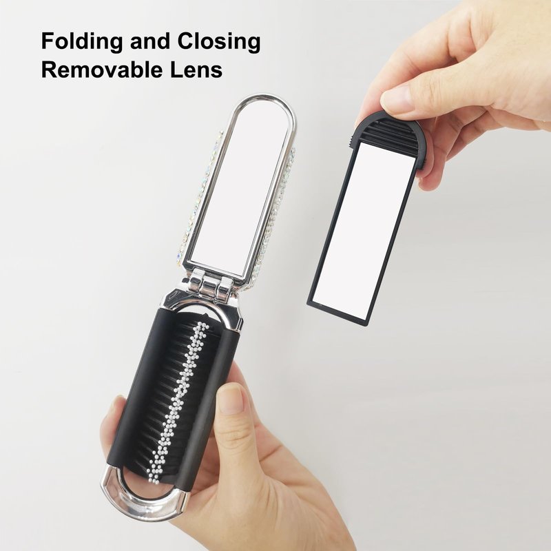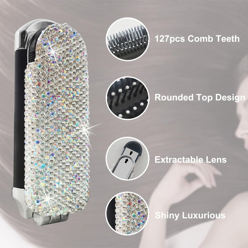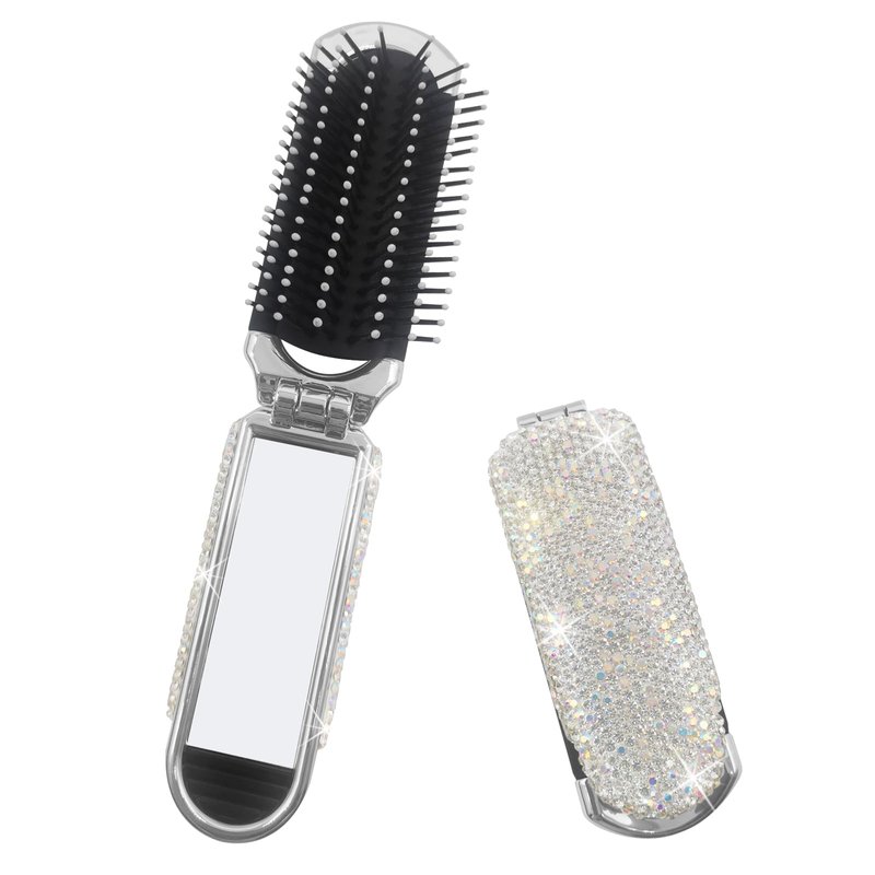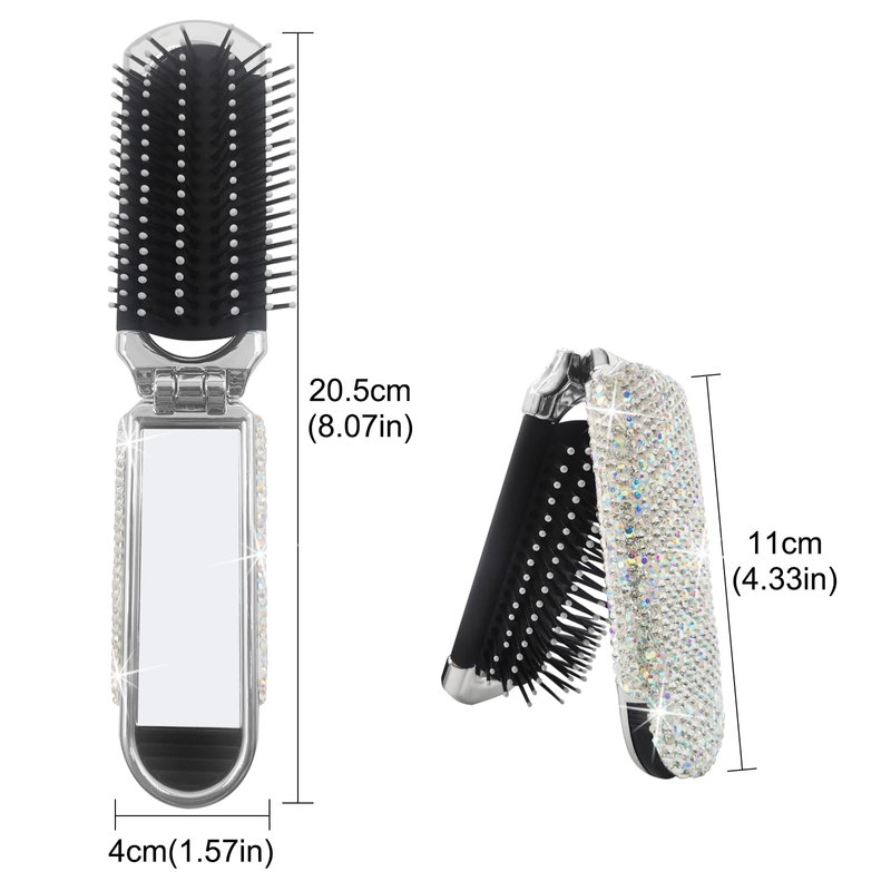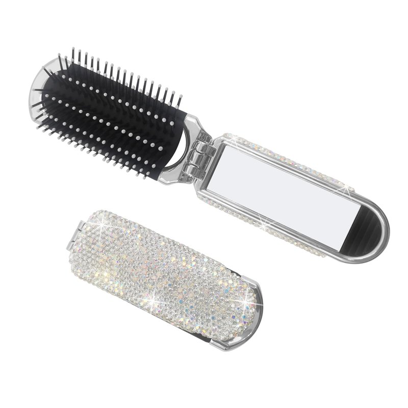Owemtao Bling Travel Hair Brush with Mirror, Rhinestone Compact Collapsible Brush for Women (Silver)