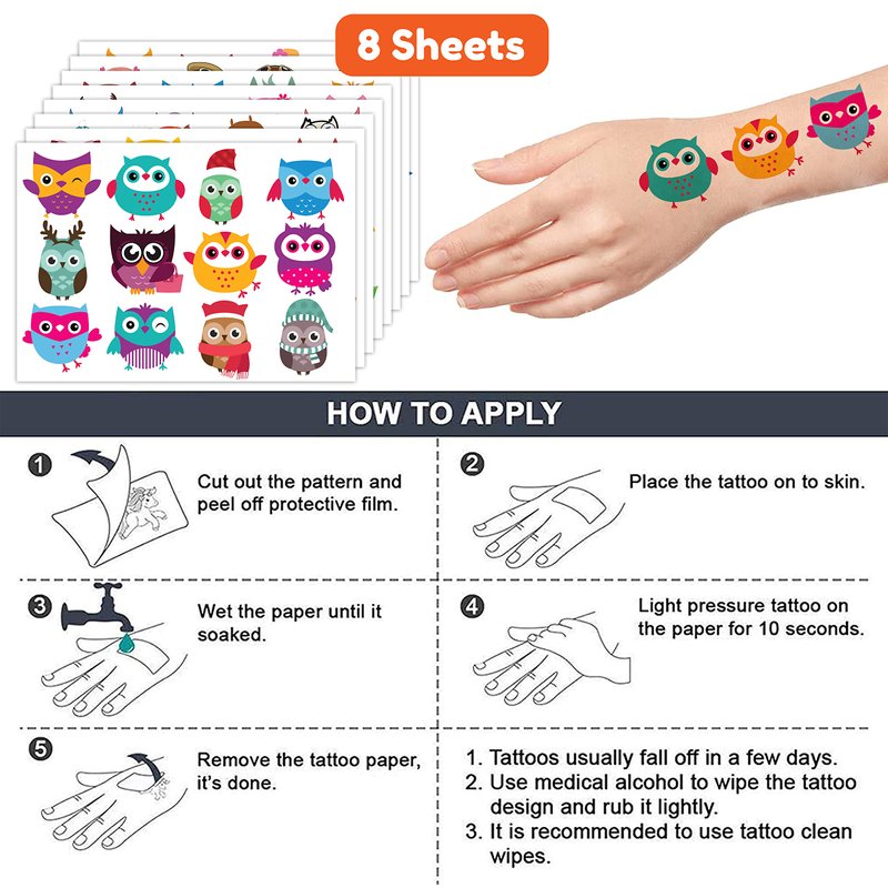 - 🦉【PERFECT TATTOOS FOR THEMED OWL DECORATIONS】: Owl temporary tattoo stickers include 8 sheets in total. There are 96Pcs super cute tattoo differences. Perfect for giving out party favors and holiday theme small gifts. The size of each sheet is 6.1 * 3.1 inches. One size fits kids.