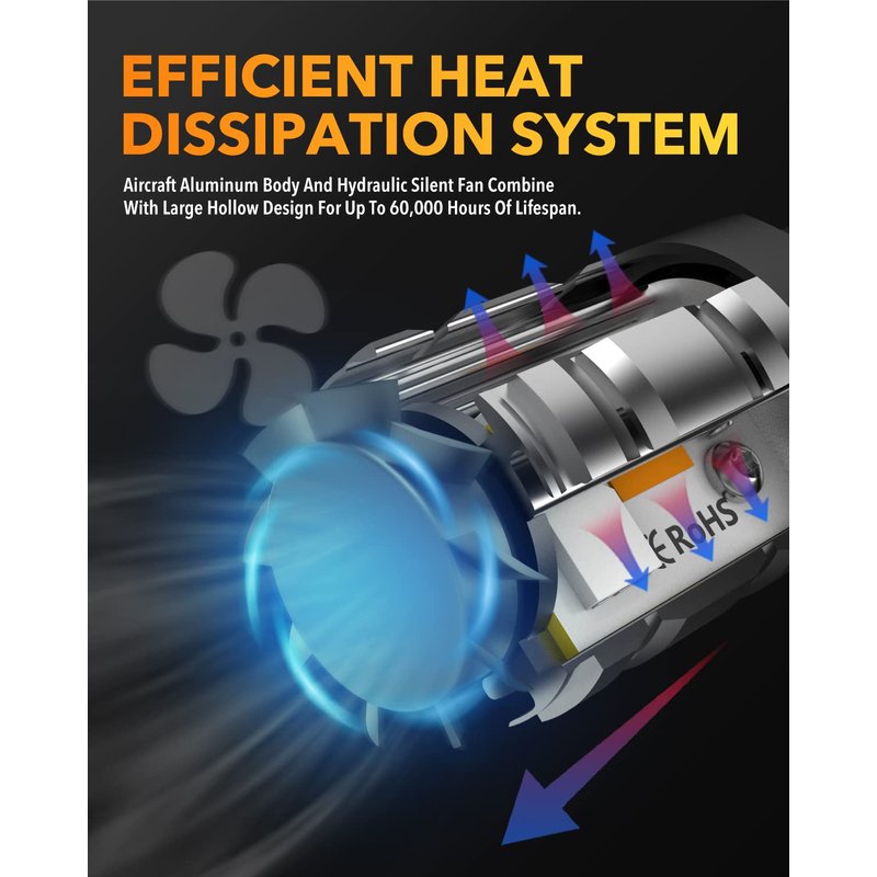 - DOUBLE COOLING DESIGN: Compared with bulbs on the market that use air cooling, T20 LED bulbs are designed with aircraft aluminum and silent turbo cooling fans that can work stably in hot weather, ensuring a a lifespan of up to 60,000 hours to accompany you on a longer journey.